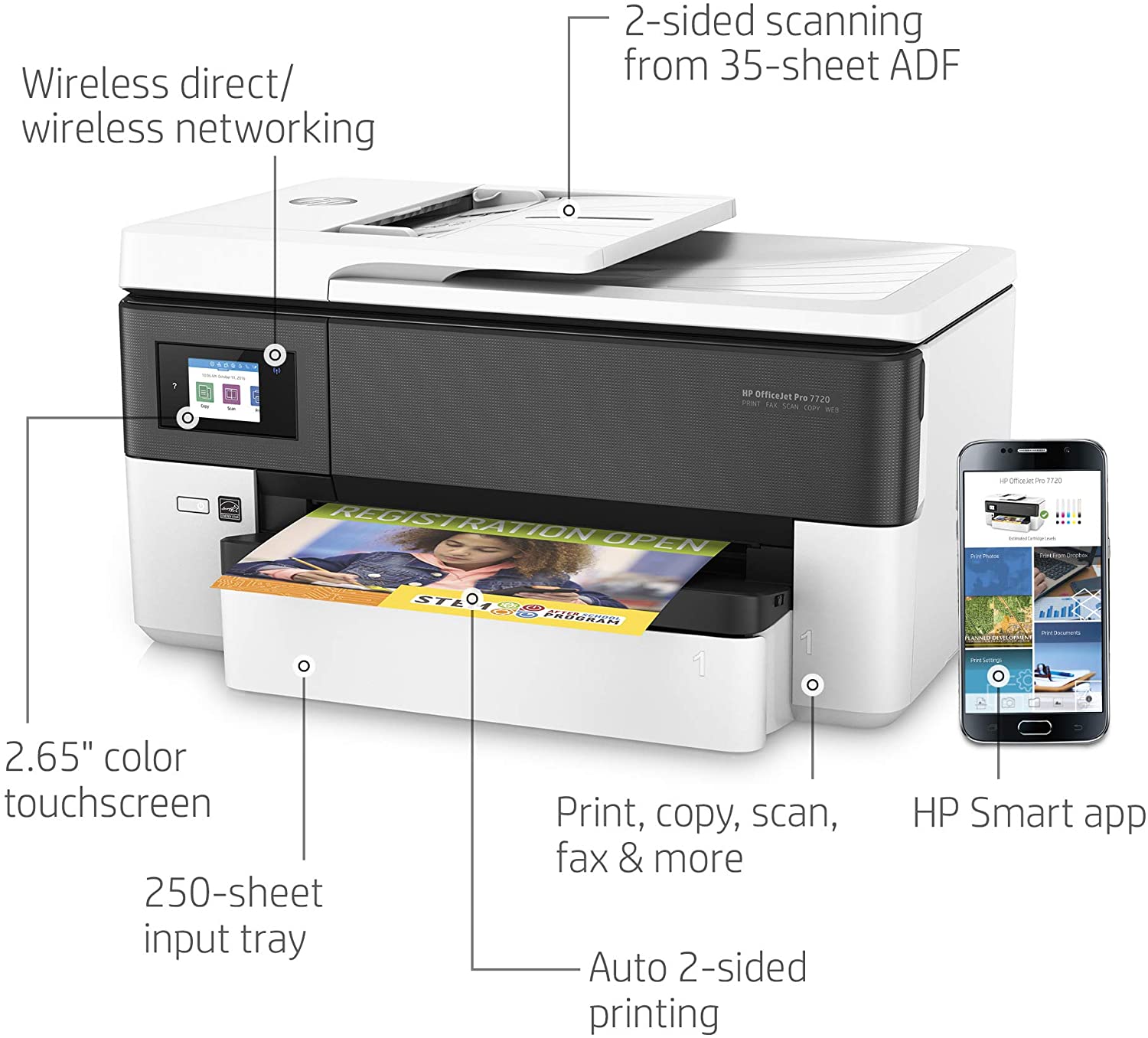 [3]Breeze through tasks with the 35-page automatic document feeder, and get automatic two-sided printing.Take control of print, scan, copy, and fax jobs, using the color touchscreen and timesaving shortcuts.